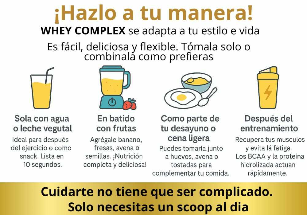 WHEY COMPLEX te aporta los nutrientes que necesitas, en segundos — incluso si no tienes tiempo de comer bien.